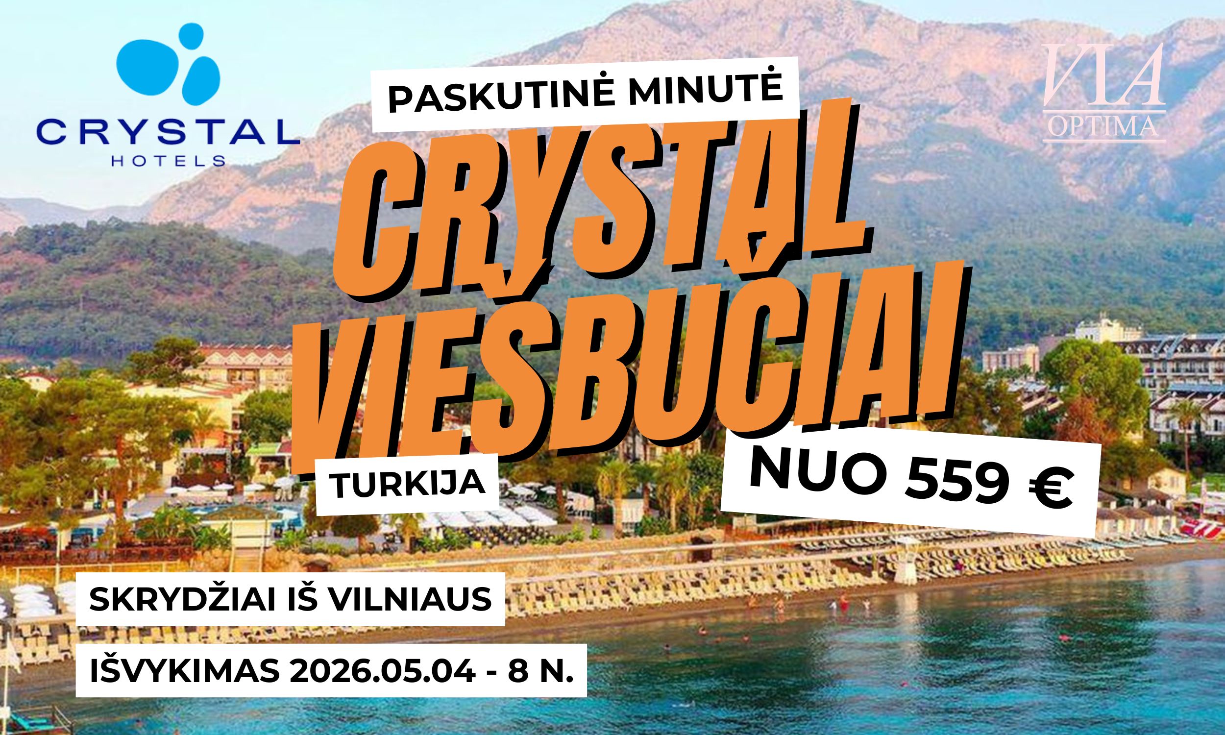 Vos nuo 559 EUR asmeniui – paskutinės minutės kelionės į Turkiją su 8 nakvynių poilsiu kokybiškuose „Crystal“ viešbučiuose. Tai puiki…